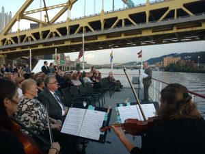 Cocktail hour violinist and a cellist duet on Gateway Clipper